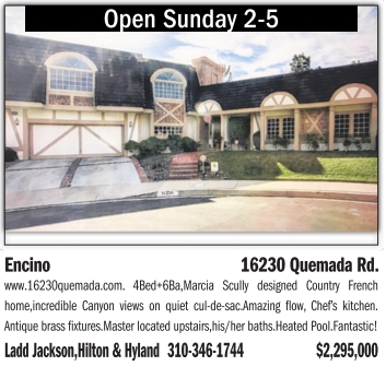 Open Sunday 2-5 Encino 16230 Quemada Rd. www.16230quemada.com. 4Bed+6Ba,Marcia Scully designed Country French home,incredible Canyon views on quiet cul-de-sac.Amazing flow, Chef’s kitchen. Antique brass fixtures.Master located upstairs,his/herbaths.Heated Pool.Fantastic! LaddJackson,Hilton &Hyland 310-346-1744 $2,295,000
