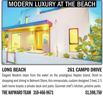 MODERN LUXURY AT THE BEACH LONG BEACH 261 CAMPO DRIVE Elegant Modern steps from the water on the prestigious Naples Island. Stroll to shopping and dining in Belmont Shore,thisimmaculate,custom-designed 3bed,2.5 bath home boastsaprivatedeck and patio.Gourmet chef’’skitchen, pristine yards. THEHAYWARD TEAM 310-466-9671 $1,598,750