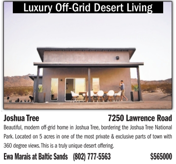 Luxury Off-Grid Desert Living Joshua Tree 7250 Lawrence Road Beautiful,modern off-grid home in JoshuaTree, bordering theJoshua Tree National Park. Locatedon5acres in oneofthe most private&exclusiveparts of town with 360 degreeviews.This is atruly uniquedesert offering. Ewa Marais at Baltic Sands (802) 777-5563 $565000