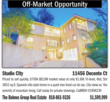 Off-Market Opportunity StudioCity 11456 Decente Ct Priced to sell quickly,$700k BELOW market value at only $1.6M.Tri-level,4bd, 5br 3652sq.ft.Spanishvilla style home in aquiet tree lined cul de sac.Cityviews w/ the serenity of mountain living.Call today for privateshowings. CalBRE# 01998239 The Bobnes Group Real Estate 818-861-9326 $1,599,999