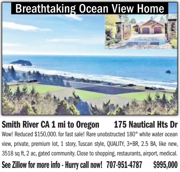 Breathtaking Ocean View Home SmithRiver CA 1mitoOregon 175Nautical HtsDr Wow! Reduced $150,000. forfast sale! Rare unobstructed 180° whitewater ocean view, private, premium lot,1story,Tuscan style, QUALITY,3+BR, 2.5 BA,like new, 3518sqft, 2ac, gated community.Closetoshopping,restaurants, airport,medical. See Zillow formoreinfo-Hurrycall now! 707-951-4787 $995,000