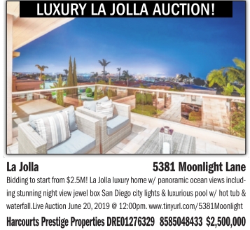 LUXURY LA JOLLA AUCTION! La Jolla 5381Moonlight Lane Bidding to startfrom$2.5M! La Jolla luxury homew/panoramic ocean views including stunning night viewjewel boxSan Diego citylights&luxurious pool w/ hottub & waterfall.Live Auction June 20, 2019 @12:00pm. www.tinyurl.com/5381Moonlight Harcourts Prestige PropertiesDRE01276329 8585048433 $2,500,000