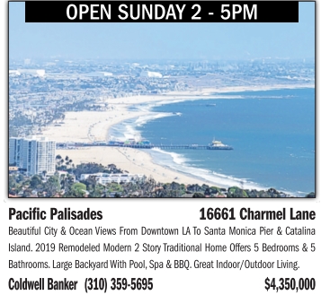 OPEN SUNDAY 2 - 5PM PacificPalisades 16661Charmel Lane Beautiful City &OceanViews From Downtown LAToSanta Monica Pier &Catalina Island. 2019 Remodeled Modern 2StoryTraditional HomeOffers5Bedrooms &5 Bathrooms.Large Backyard With Pool, Spa&BBQ.Great Indoor/Outdoor Living. Coldwell Banker (310)359-5695 $4,350,000