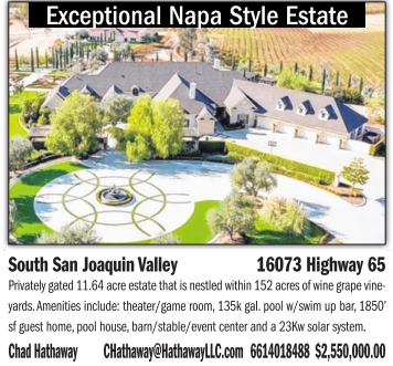 Exceptional Napa Style Estate South SanJoaquin Valley 16073 Highway 65 Privately gated 11.64 acre estate thatisnestled within 152acres of wine grape vineyards.Amenities include: theater/game room, 135kgal.poolw/swim up bar, 1850’ sf guest home, pool house, barn/stable/event center and a23Kw solar system. Chad Hathaway CHathaway@HathawayLLC.com 6614018488 $2,550,000.00