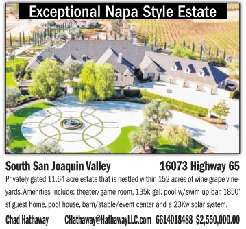 Exceptional Napa Style Estate South SanJoaquin Valley 16073 Highway 65 Privately gated 11.64 acre estate thatisnestled within 152acres of wine grape vineyards.Amenities include: theater/game room, 135kgal.poolw/swim up bar, 1850’ sf guesthome, pool house, barn/stable/event center and a23Kw solar system. Chad Hathaway CHathaway@HathawayLLC.com 6614018488 $2,550,000.00