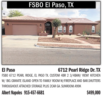 FSBO 6712 PEARL RIDGE, EL PASO TX. CUSTOM 4BR 23/4BAW/ VIEW! KITCHEN W/ BIGGRANITE ISLAND OPENTOFAMILYROOM W/FIREPLACE AND BAR.SHUTTERS THROUGHOUT.ATTACHED STORAGE PLUS2CARGA. SUNROOM.499K