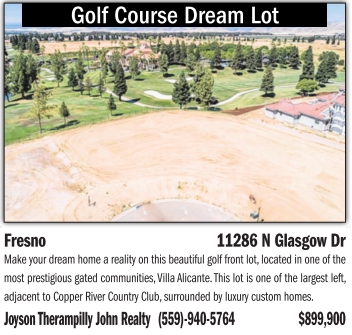 Golf Course Dream Lot Fresno 11286 NGlasgow Dr Make your dreamhome areality on this beautiful golf frontlot, located in one of the most prestigious gated communities,VillaAlicante.This lot is oneofthe largestleft, adjacent to Copper RiverCountryClub,surrounded by luxury custom homes. Joyson Therampilly John Realty (559)-940-5764 $899,900