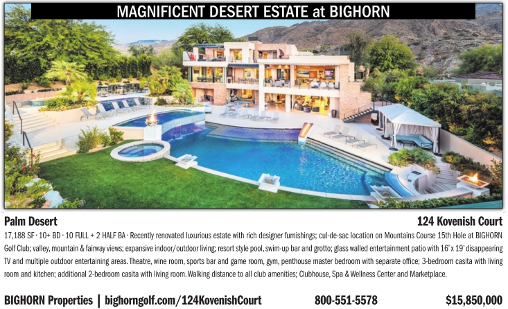 BIGHORNProperties|bighorngolf.com/124KovenishCourt 800-551-5578 $15,850,000 MAGNIFICENT DESERT ESTATE at BIGHORN PalmDesert 124 KovenishCourt 17,188SF•10+ BD •10FULL +2HALFBA•Recently renovated luxuriousestate with rich designer furnishings;cul-de-saclocationonMountainsCourse 15th Hole at BIGHORN Golf Club; valley,mountain &fairway views; expansive indoor/outdoor living;resortstyle pool,swim-up bar andgrotto; glass walled entertainmentpatio with 16’x19’disappearing TV and multiple outdoor entertaining areas.Theatre,wineroom, sports bar and game room, gym, penthousemaster bedroom with separate office; 3-bedroom casita with living roomand kitchen; additional 2-bedroom casita with living room.Walkingdistance to allclubamenities; Clubhouse, Spa&Wellness Center and Marketplace.