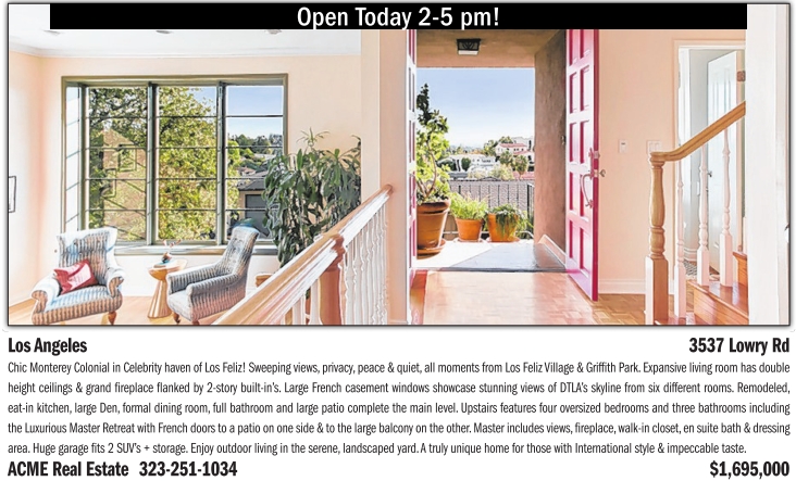 Open Today 2-5 pm! Los Angeles 3537Lowry Rd Chic Monterey ColonialinCelebrity haven of LosFeliz! Sweeping views,privacy,peace &quiet, allmoments from Los FelizVillage &Griffith Park. Expansive living room has double heightceilings&grand fireplace flanked by 2-story built-in’s. LargeFrench casementwindows showcasestunning views of DTLA’s skylinefrom sixdifferent rooms. Remodeled, eat-in kitchen, large Den, formaldining room, fullbathroom andlargepatio complete the main level. Upstairs features four oversized bedrooms andthree bathroomsincluding theLuxurious Master Retreatwith French doors to apatio on one side &tothe largebalcony on the other.Master includes views, fireplace,walk-in closet, en suite bath &dressing area.Huge garage fits 2SUV’s +storage.Enjoy outdoor livinginthe serene, landscaped yard.Atrulyunique homefor those with Internationalstyle &impeccable taste. ACMERealEstate 323-251-1034 $1,695,000