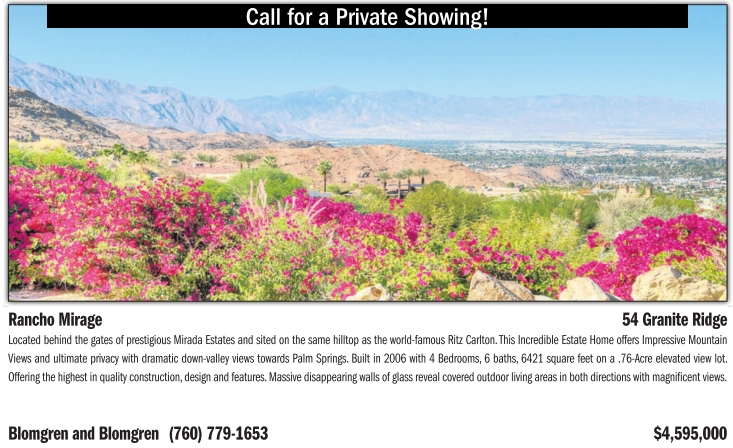 Call for a Private Showing! Rancho Mirage 54Granite Ridge Located behind thegatesofprestigious Mirada Estatesand sited on the same hilltop as theworld-famous Ritz Carlton.This Incredible Estate Homeoffers Impressive Mountain Viewsand ultimate privacy with dramatic down-valley viewstowards Palm Springs. Builtin2006 with 4Bedrooms, 6baths, 6421 square feet on a.76-Acre elevated viewlot. Offering the highestinquality construction, designand features.Massivedisappearing walls of glass revealcovered outdoor living areas in both directionswithmagnificent views. Blomgren and Blomgren (760) 779-1653 $4,595,000