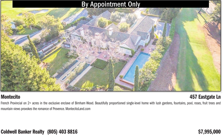 By Appointment Only Montecito 457 EastgateLn French Provincial on 2+ acres in the exclusive enclave of Birnham Wood.Beautifully proportioned single-level home with lush gardens, fountains,pool, roses, fruit trees and mountain views provokes the romance of Provence.MontecitoLand.com Coldwell Banker Realty (805) 403 8816 $7,995,000