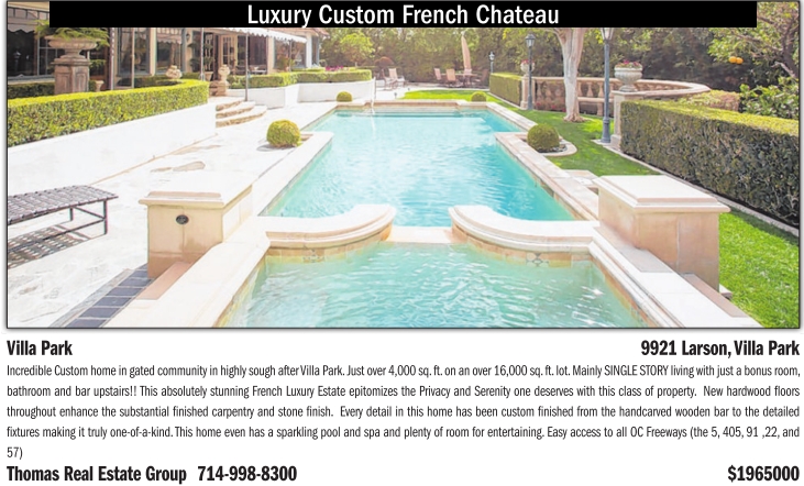 Luxury Custom French Chateau VillaPark 9921 Larson,VillaPark Incredible Custom home in gated communityinhighlysoughafterVilla Park.Justover 4,000 sq.ft.on an over 16,000 sq.ft.lot.Mainly SINGLE STORYlivingwith just abonus room, bathroom andbar upstairs!! This absolutelystunningFrench Luxury Estate epitomizesthe Privacy andSerenityone deserves with this class of property. New hardwood floors throughout enhance the substantial finishedcarpentry and stone finish. Every detail in thishome has been custom finishedfrom thehandcarved woodenbar to thedetailed fixtures making it trulyone-of-a-kind.This home even has asparkling pool and spa and plenty of room for entertaining. Easyaccess to all OC Freeways (the 5, 405, 91 ,22, and 57) ThomasReal Estate Group 714-998-8300 $1965000