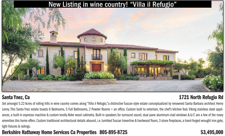 New Listing in wine country! “Villa il Refugio” Santa Ynez,Ca 1721North Refugio Rd Set amongst 5.22 Acresofrolling hills in wine country comesalong ‘’Villa il Refugio,’’adistinctiveTuscan-style estateconceptualized by renowned SantaBarbara architect Henry Lenny.This SantaYnezestate boasts6Bedrooms, 5Full Bathrooms, 2Powder Rooms +anoffice. Custombuilt to entertain, the chef’skitchenfeat.Vikingstainless steelappliances, abuilt-in espresso machine&custom knottyAlder wood cabinetry. Built-in speakers forsurround sound, dual pane aluminum-cladwindows&A/C areafewofthe many amenitiesthishome offers.Customtraditional architectural detailsabound, i.e. tumbled Tuscan travertine &hardwood floors,3stone fireplaces, ahand-forged wrought iron gate, light fixtures&railings. BerkshireHathawayHomeServicesCaProperties 805-895-8725 $3,495,000
