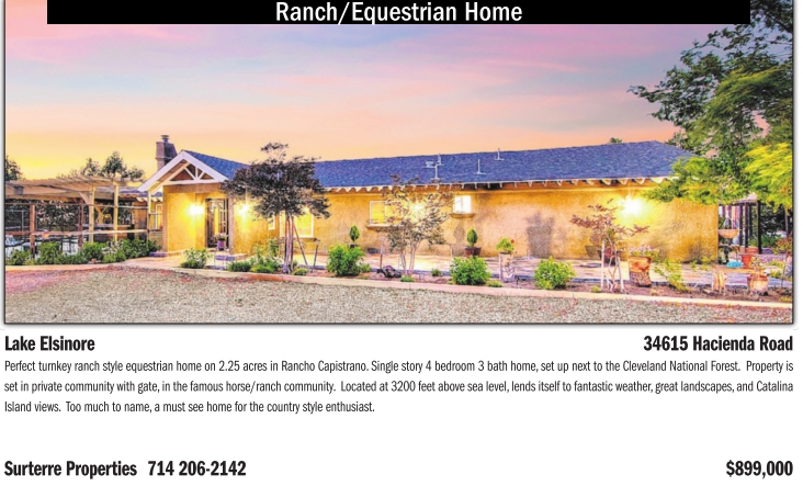 Ranch/Equestrian Home LakeElsinore 34615 HaciendaRoad Perfect turnkey ranch styleequestrian home on 2.25 acres in Rancho Capistrano.Single story 4bedroom3bath home, set up nexttothe Cleveland NationalForest. Property is setinprivate communitywithgate, in the famoushorse/ranchcommunity. Locatedat3200 feet above sea level,lends itself to fantastic weather,great landscapes, and Catalina Islandviews. Toomuch to name, amust seehome forthe country style enthusiast. Surterre Properties 714 206-2142 $899,000