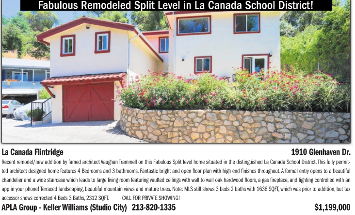 Fabulous Remodeled Split Level in La Canada School District! La CanadaFlintridge 1910 Glenhaven Dr. Recent remodel/new addition by famed architect Vaughan Trammellonthis Fabulous Split levelhome situated in thedistinguished La Canada School District.Thisfully permitted architect designed home features 4Bedrooms and3bathrooms. Fantastic bright and open floorplanwithhigh end finishesthroughout.Aformal entryopens to abeautiful chandelier andawide staircasewhich leadstolargelivingroom featuring vaulted ceilings with wall to walloak hardwood floors, agas fireplace,and lighting controlled withan app in your phone! Terracedlandscaping,beautiful mountain views and mature trees. Note:MLS still shows3beds2baths with1638 SQFT,which was prior to addition,but tax accessorshows corrected 4Beds 3Baths, 2312 SQFT. CALL FOR PRIVATE SHOWING! APLA Group -Keller Williams(Studio City) 213-820-1335 $1,199,000