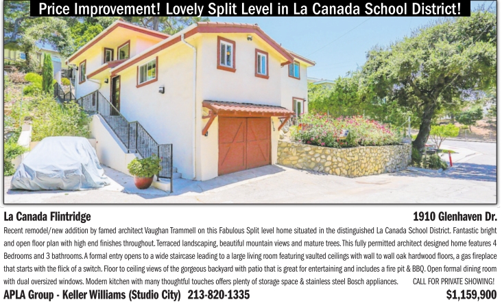 Price Improvement! Lovely Split Level in La Canada School District! La CanadaFlintridge 1910 Glenhaven Dr. Recent remodel/newadditionbyfamed architect Vaughan Trammellonthis FabulousSplit level home situated in the distinguished La Canada School District.Fantastic bright and open floor plan with high end finishesthroughout.Terraced landscaping,beautiful mountain views and mature trees.Thisfully permittedarchitect designed home features 4 Bedrooms and3bathrooms.Aformalentry openstoawide staircaseleading to alarge living roomfeaturing vaultedceilingswith walltowall oakhardwood floors, agas fireplace thatstartswiththe flickofaswitch. Floor to ceiling views of the gorgeous backyard withpatio that is greatfor entertaining and includes a fire pit&BBQ. Openformal dining room with dual oversized windows. Modernkitchen with many thoughtful touches offersplenty of storage space&stainlesssteel Bosch appliances. CALL FOR PRIVATE SHOWING! APLA Group -Keller Williams(Studio City) 213-820-1335 $1,159,900