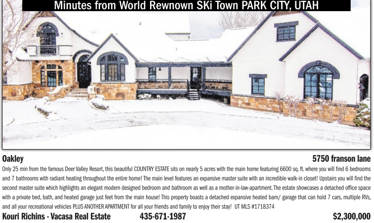 Minutes from World Rewnown SKi Town PARK CITY, UTAH Oakley 5750 franson lane Oakley 5750 franson lane Only 25 min from the famous Deer Valley Resort, this beautiful COUNTRY ESTATE sits on nearly 5 acres with the main home featuring 6600 sq. ft. where you will find 6 bedrooms and 7 bathrooms with radiant heating throughout the entire home! The main level features an expansive master suite with an incredible walk-in closet! Upstairs you will find the second master suite which highlights an elegant modern designed bedroom and bathroom as well as a mother-in-law-apartment.The estate showcases a detached office space with a private bed, bath, and heated garage just feet from the main house! This property boasts a detached expansive heated barn/ garage that can hold 7 cars, multiple RVs, and all your recreational vehicles PLUS ANOTHER APARTMENT for all your friends and family to enjoy their stay! UT MLS #1718374 Kouri Richins - Vacasa Real Estate 435-671-1987 $2,300,000