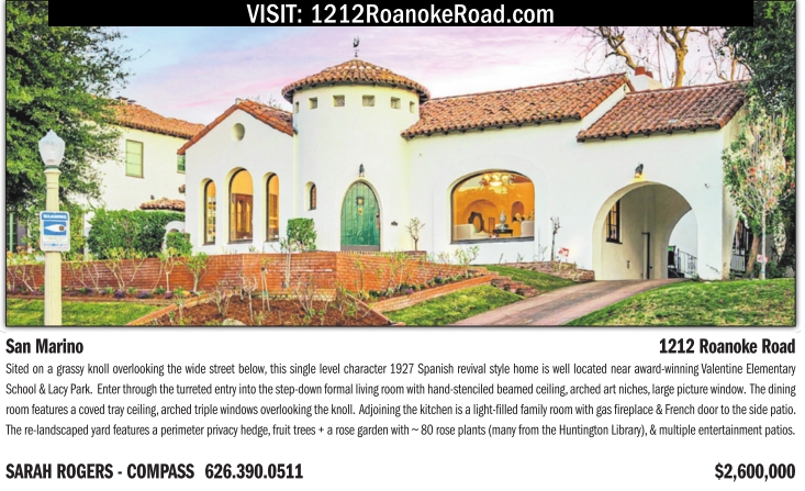 VISIT: 1212RoanokeRoad.com San Marino 1212 Roanoke Road Sited on a grassy knoll overlooking the wide street below, this single level character 1927 Spanish revival style home is well located near award-winning Valentine Elementary School & Lacy Park. Enter through the turreted entry into the step-down formal living room with hand-stenciled beamed ceiling, arched art niches, large picture window. The dining room features a coved tray ceiling, arched triple windows overlooking the knoll. Adjoining the kitchen is a light-filled family room with gas fireplace & French door to the side patio. The re-landscaped yard features a perimeter privacy hedge, fruit trees + a rose garden with ~ 80 rose plants (many from the Huntington Library),& multiple entertainment patios. SARAH ROGERS - COMPASS 626.390.0511 $2,600,000