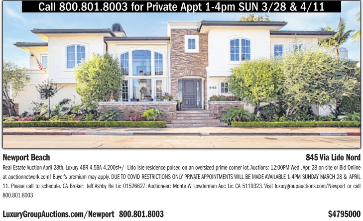 Call 800.801.8003 for Private Appt 1-4pm SUN 3/28 & 4/11 Newport Beach 845 Via Lido Nord Real Estate Auction April 28th. Luxury 4BR 4.5BA 4,200sf+/- Lido Isle residence poised on an oversized prime corner lot. Auctions: 12:00PMWed., Apr. 28 on site or Bid Online at auctionnetwork.com! Buyer’s premium may apply. DUE TO COVID RESTRICTIONS ONLY PRIVATE APPOINTMENTS WILL BE MADE AVAILABLE 1-4PM SUNDAY MARCH 28 & APRIL 11. Please call to schedule. CA Broker: Jeff Ashby Re Lic 01526627. Auctioneer: Monte W Lowderman Auc Lic CA 5119323. Visit luxurygroupauctions.com/Newport or call 800.801.8003 LuxuryGroupAuctions.com/Newport 800.801.8003 $4795000