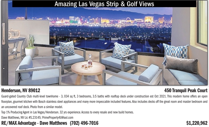Amazing Las Vegas Strip & Golf Views Henderson, NV 89012 450 Tranquil Peak Court Guard-gated Country Club multi-level townhome - 3, 034 sq ft, 3 bedrooms, 3.5 baths with rooftop deck under construction est Oct 2021. This modern home offers an open floorplan, gourmet kitchen with Bosch stainless steel appliances and many more impeccable included features.Also includes decks off the great room and master bedroom and an uncovered roof deck. Photo from a similar model. Top 1% Producing Agent in Las Vegas/Henderson. 32 yrs experience. Access to every resale and new build homes. Dave Matthews, NV Lic #S.23145; PrimeProperty4U@aol.com RE/MAXAdvantage - Dave Matthews (702) 496-7016 $1,220,962