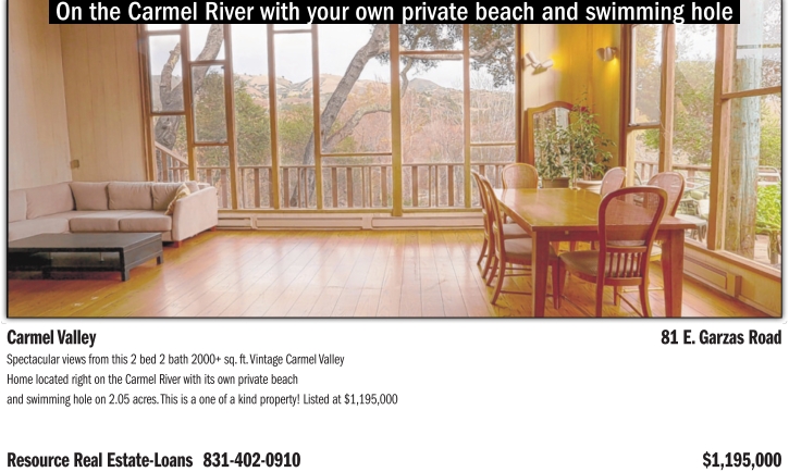 On the Carmel River with your own private beach and swimming hole Carmel Valley 81 E. Garzas Road Spectacular views from this 2 bed 2 bath 2000+ sq. ft. Vintage Carmel Valley Home located right on the Carmel River with its own private beach and swimming hole on 2.05 acres. This is a one of a kind property! Listed at $1,195,000 Resource Real Estate-Loans 831-402-0910 $1,195,000