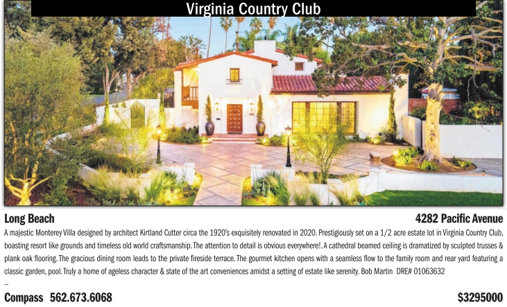 Virginia Country Club Long Beach 4282 Pacific Avenue A majestic Monterey Villa designed by architect Kirtland Cutter circa the 1920’s exquisitely renovated in 2020. Prestigiously set on a 1/2 acre estate lot in Virginia Country Club, boasting resort like grounds and timeless old world craftsmanship. The attention to detail is obvious everywhere!. A cathedral beamed ceiling is dramatized by sculpted trusses & plank oak flooring. The gracious dining room leads to the private fireside terrace. The gourmet kitchen opens with a seamless flow to the family room and rear yard featuring a classic garden, pool. Truly a home of ageless character & state of the art conveniences amidst a setting of estate like serenity. Bob Martin DRE# 01063632 -- Compass 562.673.6068 $3295000