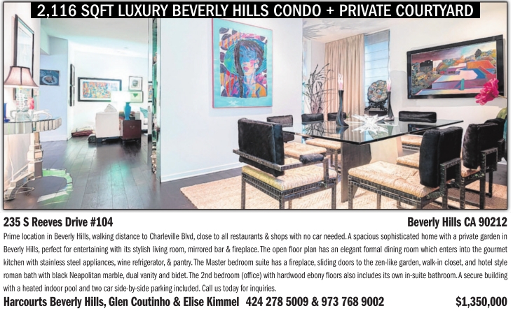 2,116 SQFT LUXURY BEVERLY HILLS CONDO + PRIVATE COURTYARD 235 S Reeves Drive #104 Beverly Hills CA 90212 Prime location in Beverly Hills, walking distance to Charleville Blvd, close to all restaurants & shops with no car needed. A spacious sophisticated home with a private garden in Beverly Hills, perfect for entertaining with its stylish living room, mirrored bar & fireplace. The open floor plan has an elegant formal dining room which enters into the gourmet kitchen with stainless steel appliances, wine refrigerator, & pantry. The Master bedroom suite has a fireplace, sliding doors to the zen-like garden, walk-in closet, and hotel style roman bath with black Neapolitan marble, dual vanity and bidet. The 2nd bedroom (office) with hardwood ebony floors also includes its own in-suite bathroom. A secure building with a heated indoor pool and two car side-by-side parking included. Call us today for inquiries. Harcourts Beverly Hills, Glen Coutinho & Elise Kimmel 424 278 5009 & 973 768 9002 $1,350,000