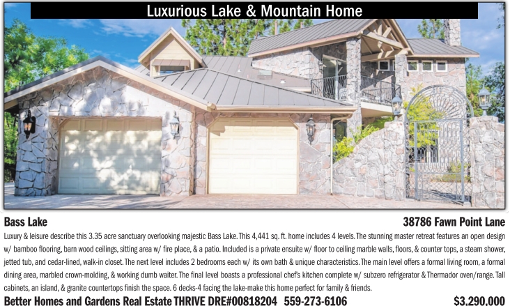 Luxurious Lake & Mountain Home Bass Lake 38786 Fawn Point Lane Luxury & leisure describe this 3.35 acre sanctuary overlooking majestic Bass Lake. This 4,441 sq. ft. home includes 4 levels. The stunning master retreat features an open design w/ bamboo flooring, barn wood ceilings, sitting area w/ fire place, & a patio. Included is a private ensuite w/ floor to ceiling marble walls, floors,& counter tops, a steam shower, jetted tub, and cedar-lined, walk-in closet. The next level includes 2 bedrooms each w/ its own bath & unique characteristics.The main level offers a formal living room, a formal dining area, marbled crown-molding, & working dumb waiter. The final level boasts a professional chef’s kitchen complete w/ subzero refrigerator & Thermador oven/range. Tall cabinets, an island, & granite countertops finish the space.6 decks-4 facing the lake-make this home perfect for family & friends. Better Homes and Gardens Real Estate THRIVE DRE#00818204 559-273-6106 $3,290,000