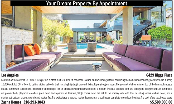 Your Dream Property By Appointment Los Angeles 6429 Riggs Place Featured on the cover of CA Home + Design, this custom-built 6,000 sq. ft. residence is warm and welcoming without sacrificing the homes modern design aesthetic. On a nearly 16,000 sq ft lot. 50’ of floor to ceiling sliding patio drs that stack highlighting indr/outdr living. Expansive great room. The gourmet kitchen features top of the line appliances, a butlers pantry with second sink, dishwasher and storage. This an entertainers paradise wine room; a modern fireplace opens to both the dining and living rm; walk in bar; media rm; powder bath; playroom; an office, guest bdrm and separate ba. Upstairs, 3 lrge bdrms, down the hall to the primary suite with floor to ceiling sliders, walk-in closet, and a master bath, steam shower, spa tub and heated flrs. The ext features a covered heated lounge area; a pool house complete w/outdoor fireplace. The pool offers spa, bocce court. Zacha Homes 310-293-3043 $5,500,000.00