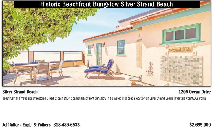 Historic Beachfront Bungalow Silver Strand Beach Silver Strand Beach 1205 Ocean Drive Beautifully and meticulously restored 3 bed, 2 bath 1934 Spanish beachfront bungalow in a coveted mid-beach location on Silver Strand Beach in Ventura County, California. Jeff Adler - Engel & Völkers 818-489-6533 $2,695,000