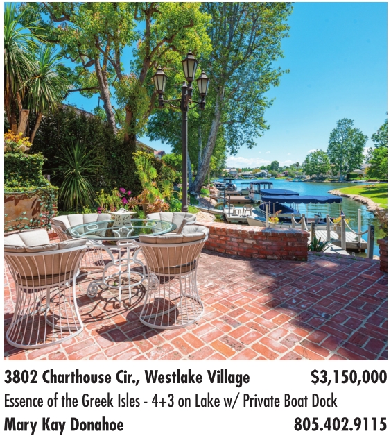 3802 Charthouse Cir., Westlake Village $3,150,000 Essence of the Greek Isles - 4+3 on Lake w/ Private Boat Dock Mary Kay Donahoe 805.402.9115