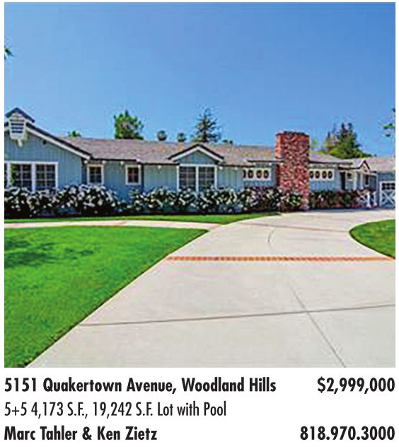 5151 Quakertown Avenue, Woodland Hills $2,999,000 5+5 4,173 S.F., 19,242 S.F. Lot with Pool Marc Tahler & Ken Zietz 818.970.3000