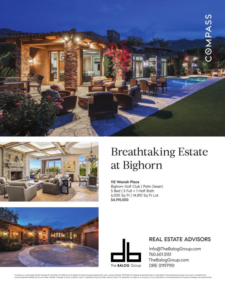 Breathtaking Estate at Bighorn 112 Wanish Place Bighorn Golf Club | Palm Desert 5 Bed | 5 Full + 1 Half Bath 6,000 Sq Ft | 14,810 Sq Ft Lot $4,195,000 REAL ESTATE ADVISORS Info@TheBalogGroup.com 760.601.5151 TheBalogGroup.com DRE 01197951 Compass is areal estate broker licensed bythe State ofCalifornia and abides by Equal Housing Opportunity laws. License Number 01991628. All material presented herein is intended for informational purposes only and iscompiled from sources deemed reliable but has not been verified. Changes inprice, condition, sale or withdrawal may be made without notice. No statement ismade as to accuracy ofany description. All measurements and square footages are approximate.