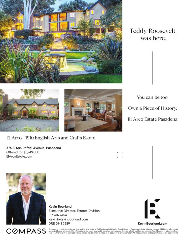 Teddy Roosevelt was here. You can be too. Own a Piece of History. El Arco Estate Pasadena El Arco - 1910 English Arts and Crafts Estate 375 S. San Rafael Avenue, Pasadena Offered for $6,749,000 ElArcoEstate.com Kevin Bourland Executive Director, Estates Division 213.407.4754 Kevin@KevinBourland.com DRE 01486389 KevinBourland.com Compass is a real estate broker licensed by the State of California and abides by Equal Housing Opportunity laws. License Number 01991628. All material presented herein is intended for informational purposes only and is compiled from sources deemed reliable but has not been verified. Changes inprice, condition, sale or withdrawal may bemade without notice. No statement ismade as to accuracy of any description. All measurements and square footages are approximate.