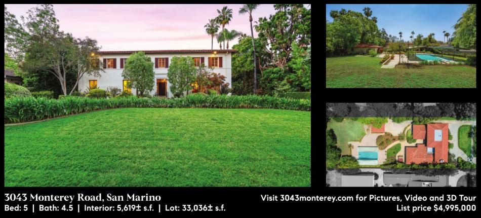 3043 Monterey Road, San Marino Visit 3043monterey.com for Pictures, Video and 3D Tour Bed: 5 | Bath: 4.5 | Interior: 5,619± s.f. | Lot: 33,036± s.f. List price $4,995,000