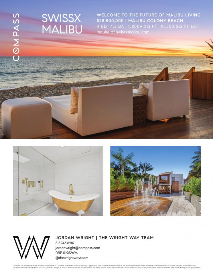 SWISSX MALIBU WELCOME TO THE FUTURE OF MALIBU LIVING $28,500,000 | MALIBU COLONY BEACH 4 BD 4.5 BA 4,200+ SQ FT 10,500 SQ FT LOT Inquire at swissxmalibu.com JORDAN WRIGHT | THE WRIGHT WAY TEAM 818.746.6987 jordanwright@compass.com DRE 01952694 @thewrightwayteam Compass is areal estate broker licensed bythe State ofCalifornia and abides by Equal Housing Opportunity laws. License Number 01991628. All material presented herein is intended for informational purposes only and iscompiled from sources deemed reliable but has not been verified. Changes inprice, condition, sale or withdrawal may be made without notice. No statement ismade as to accuracy ofany description. All measurements and square footages are approximate.