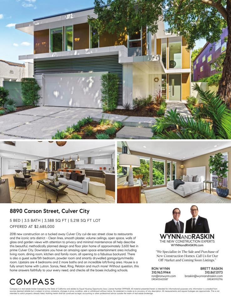 2018 new construction on a tucked away Culver City cul-de-sac street close to restaurants and the iconic arts district - Clean lines, smooth plaster, volume ceilings, open space, walls of glass and garden views with attention to privacy and minimal maintenance all help describe this beautiful, methodically planned design and floor plan home of approximately 3,600 feet in prime Culver City. Downstairs you have an amazing open space entertainment area including living room, dining room, kitchen and family room, all opening to a fabulous backyard. There is also a guest suite/5th bedroom, powder room and smartly drywalled garage/gym/media room. Upstairs are 4 bedrooms and 2 more baths and an incredible loft/living area. House is a fully smart home with Lutron. Sonos, Nest, Ring, Peloton and much more! without question, this home answers faithfully to your every need, and checks all the boxes including schools.