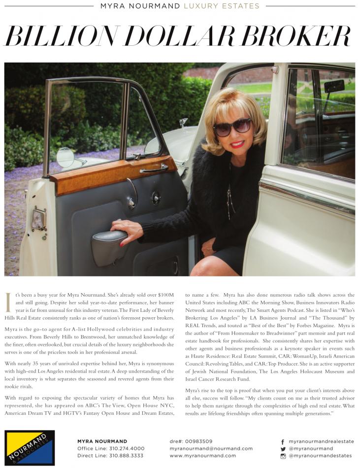 MYRA NOURMAND LUXURY ESTATES BILLION DOLLAR BROKERIt’s been a busy year for Myra Nourmand. She’s already sold over $100M and still going. Despite her solid year-to-date performance, her banner year is far from unusual for this industry veteran.The First Lady of Beverly Hills Real Estate consistently ranks as one of nation’s foremost power brokers. Myra is the go-to agent for A-list Hollywood celebrities and industry executives. From Beverly Hills to Brentwood, her unmatched knowledge of the finer, often overlooked, but crucial details of the luxury neighborhoods she serves is one of the priceless tools in her professional arsenal. With nearly 35 years of unrivaled expertise behind her, Myra is synonymous with high-end Los Angeles residential real estate. A deep understanding of the local inventory is what separates the seasoned and revered agents from their rookie rivals. With regard to exposing the spectacular variety of homes that Myra has represented, she has appeared on ABC’s The View, Open House NYC, American Dream TV and HGTV’s Fantasy Open House and Dream Estates, to name a few. Myra has also done numerous radio talk shows across the United States including ABC the Morning Show, Business Innovators Radio Network and most recently, The Smart Agents Podcast. She is listed in “Who’s Brokering Los Angeles” by LA Business Journal and “The Thousand” by REAL Trends, and touted as “Best of the Best” by Forbes Magazine. Myra is the author of “From Homemaker to Breadwinner” part memoir and part real estate handbook for professionals. She consistently shares her expertise with other agents and business professionals as a keynote speaker in events such as Haute Residence: Real Estate Summit, CAR: Woman Up, Israeli American Council: Revolving Tables, and CAR: Top Producer. She is an active supporter of Jewish National Foundation, The Los Angeles Holocaust Museum and Israel Cancer Research Fund. Myra’s rise to the top is proof that when you put your client’s interests above all else, success will follow. “My clients count on me as their trusted advisor to help them navigate through the complexities of high end real estate. What results are lifelong friendships often spanning multiple generations.”