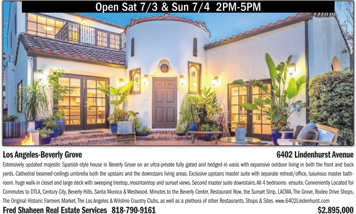 Open Sat 7/3 & Sun 7/4 2PM-5PM Los Angeles-Beverly Grove 6402 Lindenhurst Avenue Extensively updated majestic Spanish-style house in Beverly Grove on an ultra-private fully gated and hedged-in oasis with expansive outdoor living in both the front and back yards. Cathedral beamed-ceilings umbrella both the upstairs and the downstairs living areas. Exclusive upstairs master suite with separate retreat/office, luxurious master bathroom. huge walk-in closet and large deck with sweeping treetop, mountaintop and sunset views. Second master suite downstairs. All 4 bedrooms ensuite. Conveniently Located for Commutes to DTLA, Century City, Beverly Hills, Santa Monica & Westwood. Minutes to the Beverly Center, Restaurant Row, the Sunset Strip, LACMA, The Grove, Rodeo Drive Shops, The Original Historic Farmers Market,The Los Angeles & Wilshire Country Clubs, as well as a plethora of other Restaurants, Shops & Sites. www.6402Lindenhurst.com Fred Shaheen Real Estate Services 818-790-9161 $2,895,000