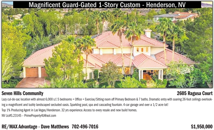 Magnificent Guard-Gated 1-Story Custom - Henderson, NV Seven Hills Community 2605 Ragusa Court Lazy cul-de-sac location with almost 6,000 s.f.5 bedrooms + Office + Exercise/Sitting room off Primary Bedroom & 7 baths. Dramatic entry with soaring 26-foot ceilings overlooking a magnificent and lushly landscaped secluded oasis. Sparkling pool, spa and cascading fountain. 4-car garage and over a 1/2 acre lot! Top 1% Producing Agent in Las Vegas/Henderson. 32 yrs experience.Access to every resale and new build homes. NV Lic#S.23145 – PrimeProperty4U@aol.com RE/MAX Advantage - Dave Matthews 702-496-7016 $1,950,000