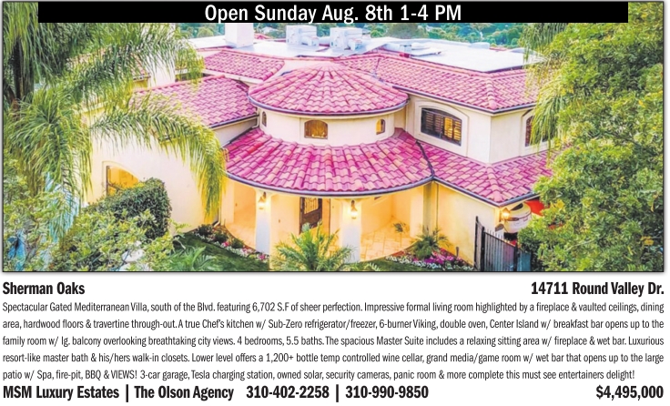 Open Sunday Aug. 8th 1-4 PM Sherman Oaks 14711 Round Valley Dr. Spectacular Gated Mediterranean Villa, south of the Blvd. featuring 6,702 S.F of sheer perfection. Impressive formal living room highlighted by a fireplace & vaulted ceilings, dining area, hardwood floors & travertine through-out. A true Chef’s kitchen w/ Sub-Zero refrigerator/freezer, 6-burner Viking, double oven, Center Island w/ breakfast bar opens up to the family roomw/ lg. balcony overlooking breathtaking city views. 4 bedrooms, 5.5 baths. The spacious Master Suite includes a relaxing sitting area w/ fireplace & wet bar. Luxurious resort-like master bath & his/hers walk-in closets. Lower level offers a 1,200+ bottle temp controlled wine cellar, grand media/game room w/ wet bar that opens up to the large patio w/ Spa, fire-pit, BBQ & VIEWS! 3-car garage, Tesla charging station, owned solar, security cameras, panic room & more complete this must see entertainers delight! MSM Luxury Estates |The Olson Agency 310-402-2258 | 310-990-9850 $4,495,000