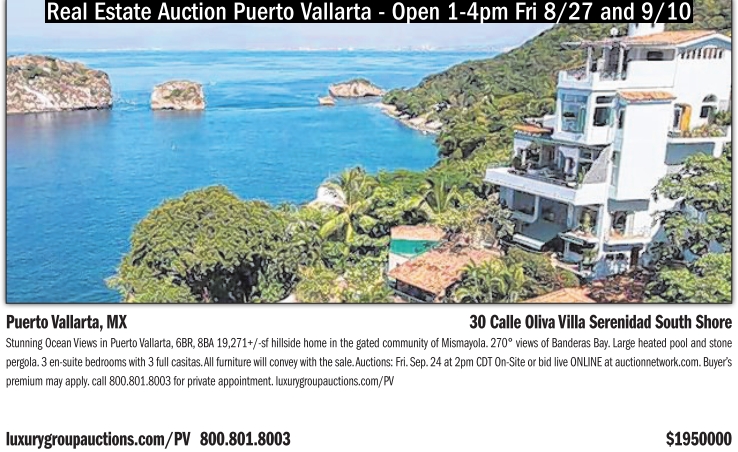 Real Estate Auction Puerto Vallarta - Open 1-4pm Fri 8/27 and 9/10 Puerto Vallarta, MX 30 Calle Oliva Villa Serenidad South Shore Stunning Ocean Views in Puerto Vallarta, 6BR, 8BA 19,271+/-sf hillside home in the gated community of Mismayola. 270° views of Banderas Bay. Large heated pool and stone pergola. 3 en-suite bedrooms with 3 full casitas.All furniture will convey with the sale.Auctions: Fri. Sep. 24 at 2pm CDT On-Site or bid live ONLINE at auctionnetwork.com. Buyer’s premium may apply. call 800.801.8003 for private appointment. luxurygroupauctions.com/PV luxurygroupauctions.com/PV 800.801.8003 $1950000