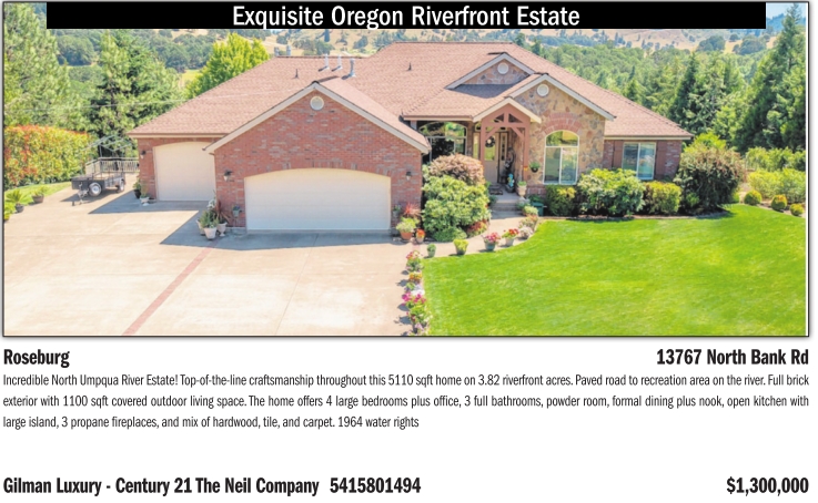 Exquisite Oregon Riverfront Estate Roseburg 13767 North Bank Rd Incredible North Umpqua River Estate! Top-of-the-line craftsmanship throughout this 5110 sqft home on 3.82 riverfront acres. Paved road to recreation area on the river. Full brick exterior with 1100 sqft covered outdoor living space. The home offers 4 large bedrooms plus office, 3 full bathrooms, powder room, formal dining plus nook, open kitchen with large island, 3 propane fireplaces, and mix of hardwood, tile, and carpet. 1964 water rights Gilman Luxury - Century 21 The Neil Company 5415801494 $1,300,000