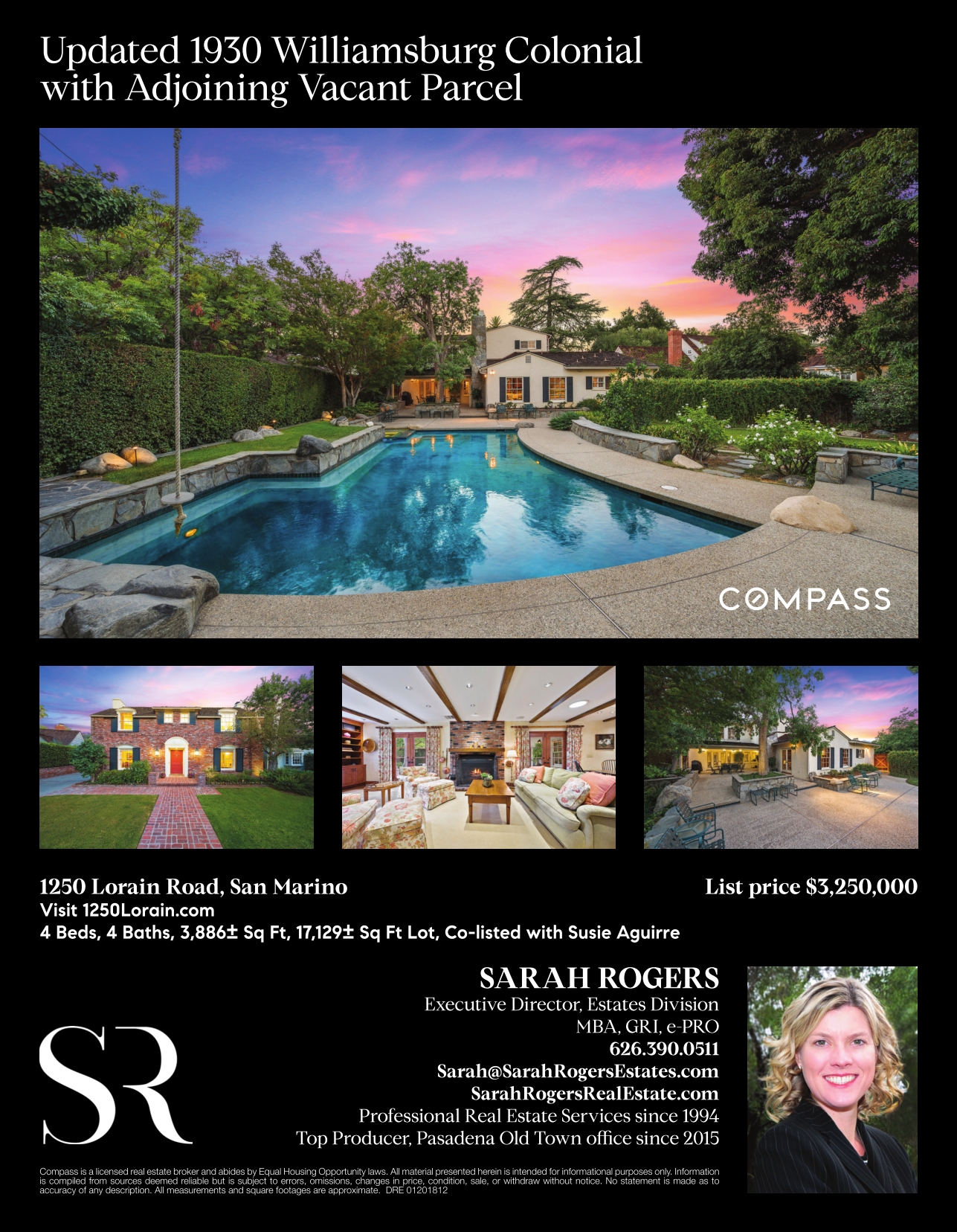 Executive Director, Estates Division MBA, GRI, e-PRO 626.390.0511 Sarah@SarahRogersEstates.com SarahRogersRealEstate.com Professional Real Estate Services since 1994 Top Producer, Pasadena Old Town office since 2015