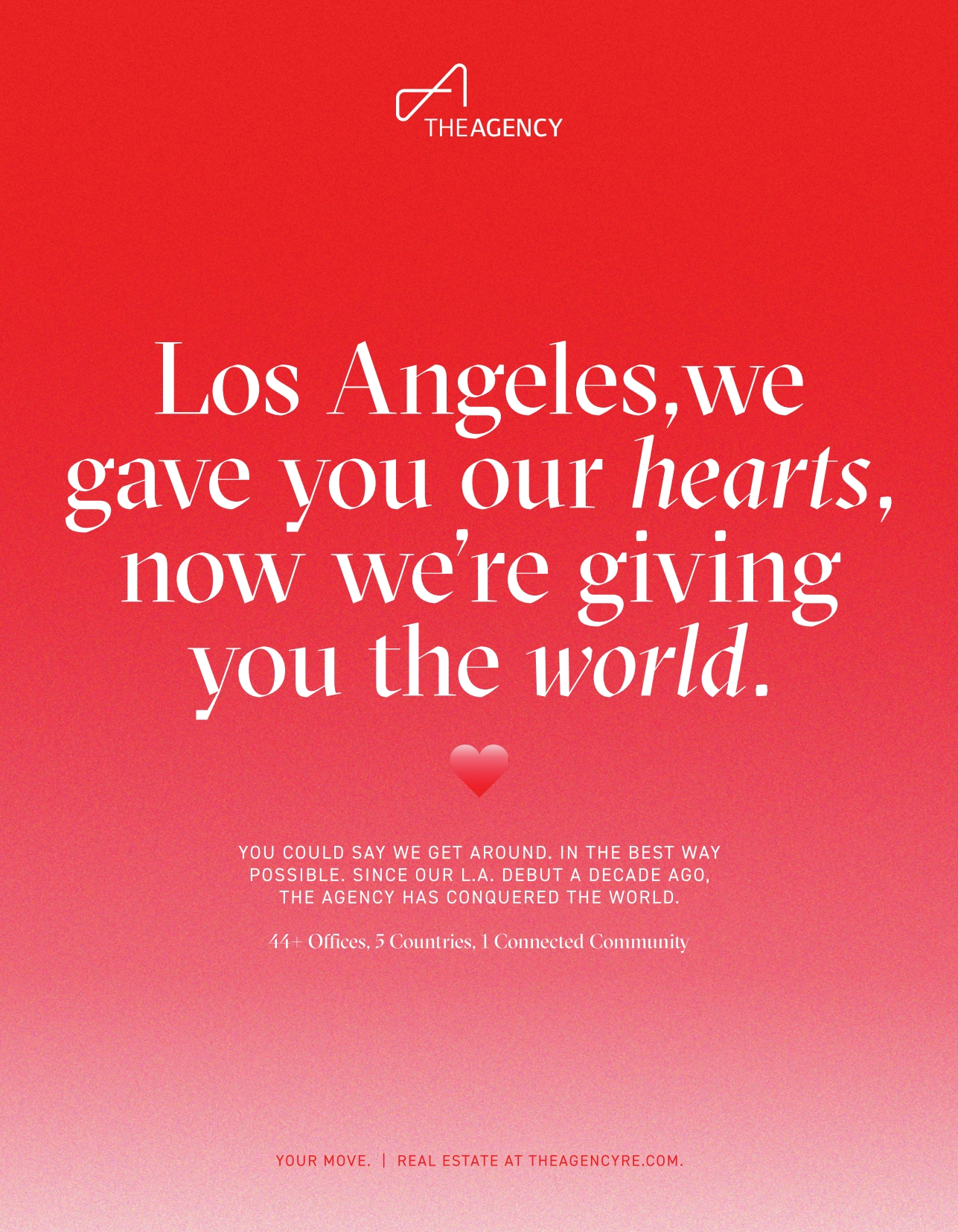 Los Angeles, we gave you our hearts, now we’re giving you the world. YOU COULD SAY WE GET AROUND. IN THE BEST WAY POSSIBLE. SINCE OUR L.A. DEBUT A DECADE AGO, THE AGENCY HAS CONQUERED THE WORLD. 44+ Offices, 5 Countries, 1 Connected Community YOUR MOVE. | REAL ESTATE AT THEAGENCYRE.COM.