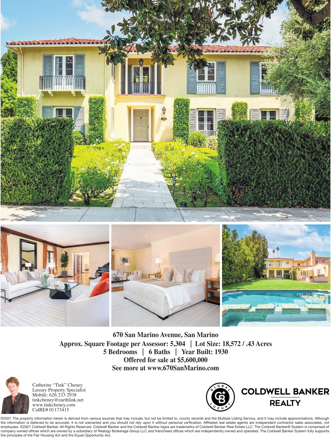 670 San Marino Avenue, San Marino Approx. Square Footage per Assessor: 5,304 | Lot Size: 18,572 / .43 Acres 5 Bedrooms | 6 Baths | Year Built: 1930 Offered for sale at $5,600,000 See more at www.670SanMarino.com Catherine “Tink” Cheney Luxury Property Specialist Mobile: 626 233 2938 tinkcheney@earthlink.net www.tinkcheney.com CalRE# 01173415