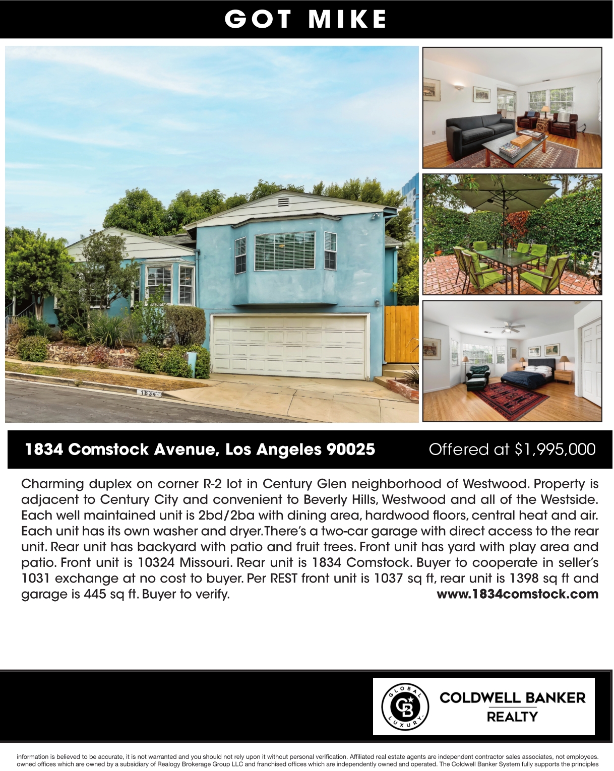 Charming duplex on corner R-2 lot in Century Glen neighborhood of Westwood. Property is adjacent to Century City and convenient to Beverly Hills, Westwood and all of the Westside. Each well maintained unit is 2bd/2ba with dining area, hardwood floors,central heat and air. Each unit has its own washer and dryer. There’s a two-car garage with direct access to the rear unit. Rear unit has backyard with patio and fruit trees. Front unit has yard with play area and patio. Front unit is 10324 Missouri. Rear unit is 1834 Comstock. Buyer to cooperate in seller’s 1031 exchange at no cost to buyer. Per REST front unit is 1037 sq ft, rear unit is 1398 sq ft and garage is 445 sq ft. Buyer to verify. www.1834comstock.com