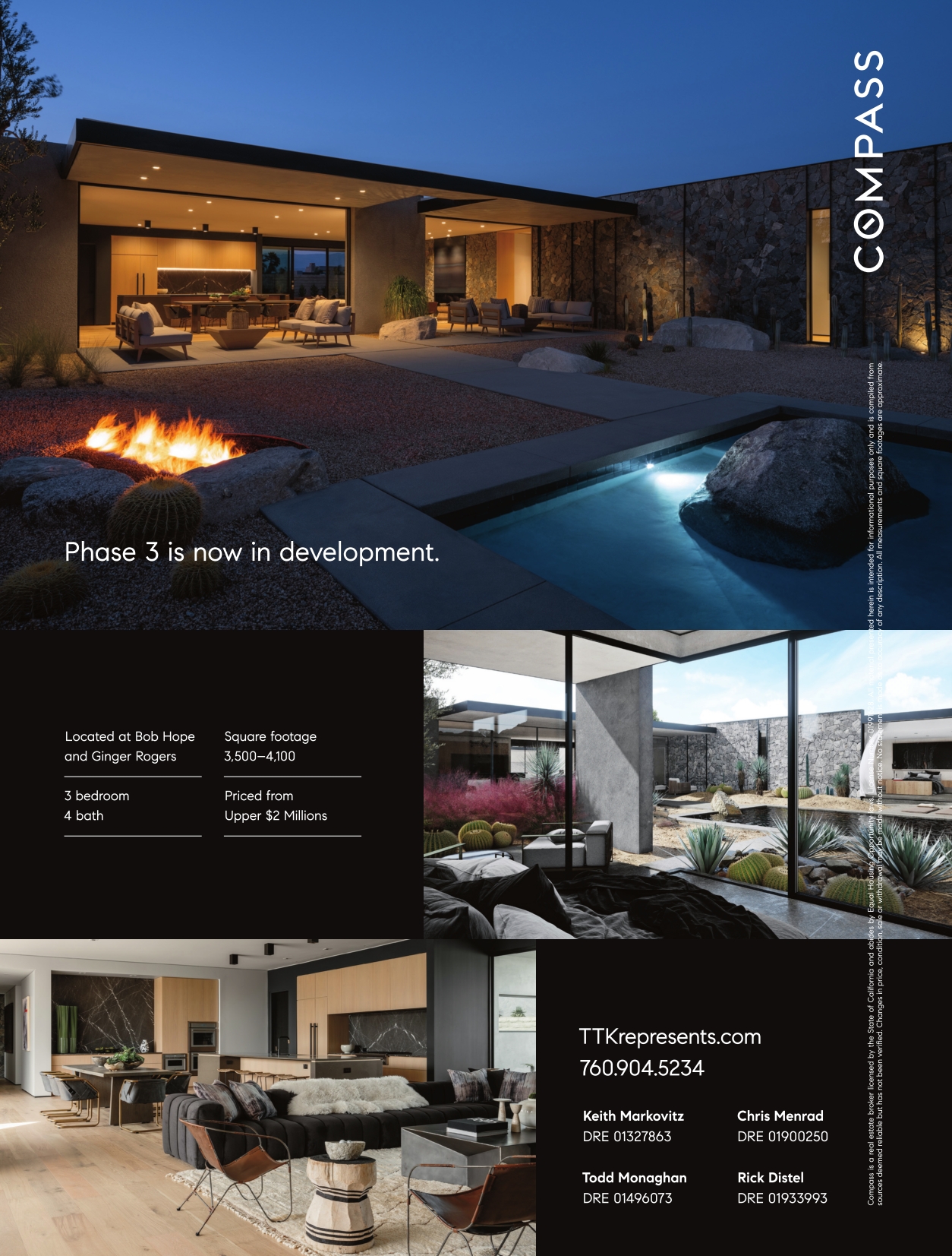 Phase 3 is now in development. Located at Bob Hope and Ginger Rogers Square footage 3,500–4,100 3 bedroom 4 bath Priced from Upper $2 Millions TTKrepresents.com 760.904.5234 Keith Markovitz DRE 01327863 Chris Menrad DRE 01900250 Todd Monaghan DRE 01496073 Rick Distel DRE 01933993