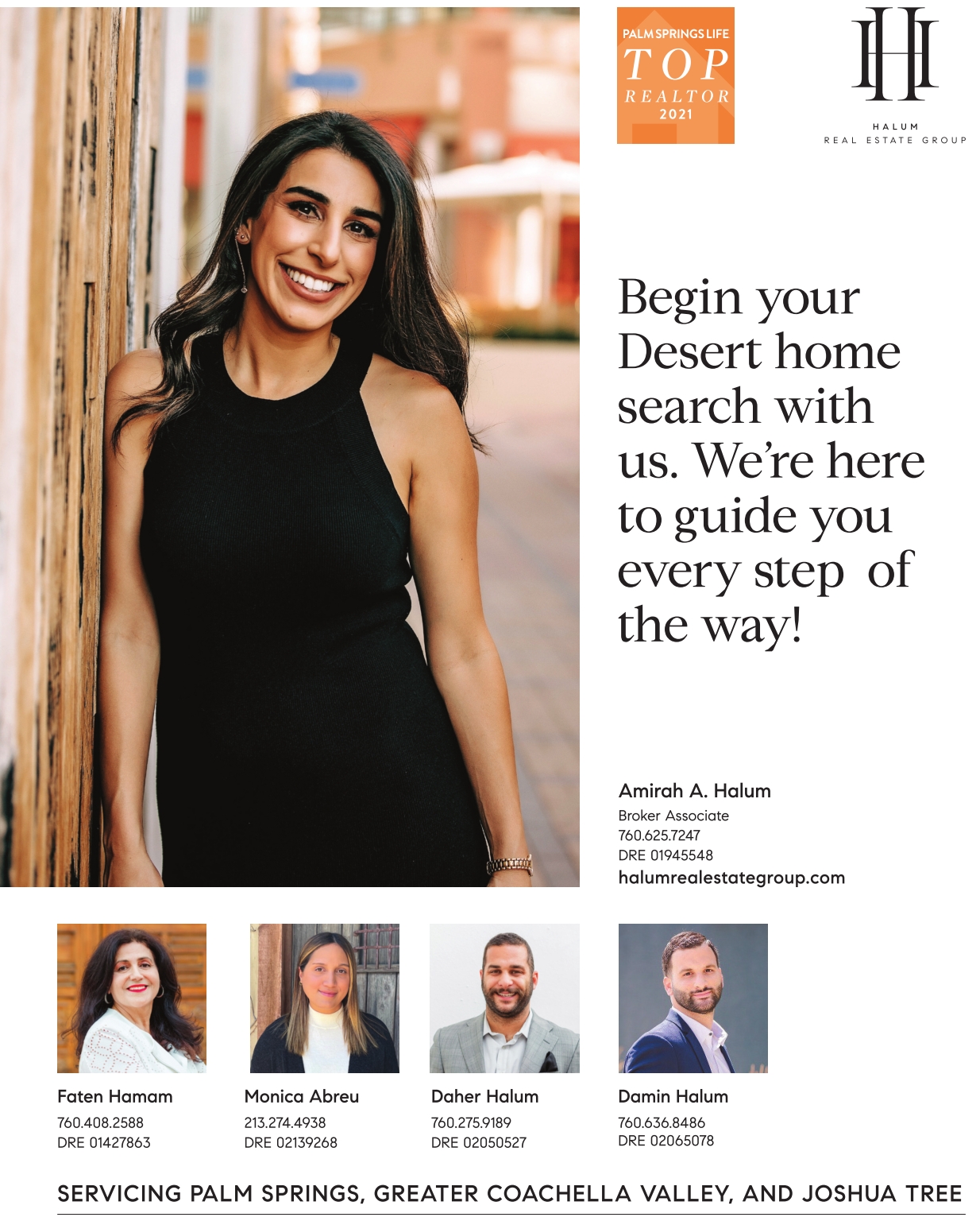 TOP REALTOR 2021 Begin your Desert home search with us. We’re here to guide you every step of the way! Amirah A. Halum Broker Associate 760.625.7247 DRE 01945548 halumrealestategroup.com Faten Hamam 760.408.2588 DRE 01427863 Monica Abreu 213.274.4938 DRE 02139268 Daher Halum 760.275.9189 DRE 02050527 Damin Halum 760.636.8486 DRE 02065078 SERVICING PALM SPRINGS, GREATER COACHELLA VALLEY, AND JOSHUA TREE