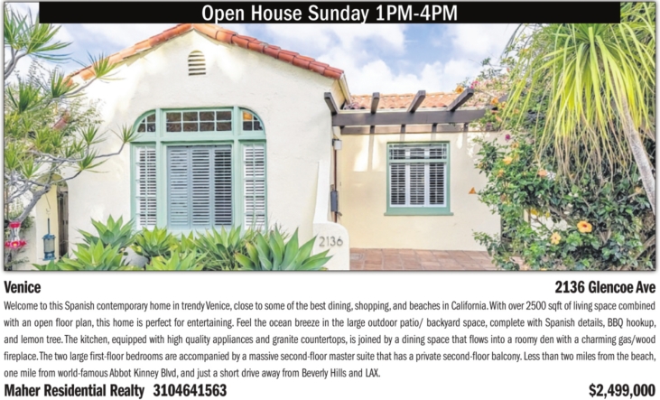 Open House Sunday 1PM-4PM Venice 2136 Glencoe Ave Welcome to this Spanish contemporary home in trendy Venice, close to some of the best dining, shopping, and beaches in California. With over 2500 sqft of living space combined with an open floor plan, this home is perfect for entertaining. Feel the ocean breeze in the large outdoor patio/backyard space, complete with Spanish details, BBQ hookup, and lemon tree. The kitchen, equipped with high quality appliances and granite countertops, is joined by a dining space that flows into a roomy den with a charming gas/wood fireplace. The two large first-floor bedrooms are accompanied by a massive second-floor master suite that has a private second-floor balcony. Less than two miles from the beach, one mile from world-famous Abbot Kinney Blvd, and just a short drive away from Beverly Hills and LAX. Maher Residential Realty 3104641563 $2,499,000